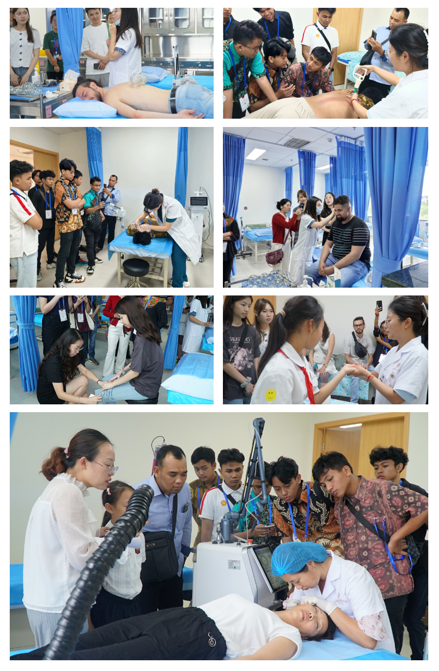 留學生們(men) 參觀了醫院中藥房、針灸推拿康複科、皮膚美容科及兒(er) 科,深度體(ti) 驗了小兒(er) 推拿耳穴、中藥麵膜冷噴、針灸治療、刮痧拔罐等經典中醫項目,全方位領略了中醫藥的獨特魅力。這一過程中,留學生們(men) 展現出極高的學習(xi) 熱情與(yu) 好奇心,他們(men) 認真聆聽講解,積極參與(yu) 互動,對中醫藥的療效與(yu) 智慧讚不絕口,紛紛表示中醫療法“簡便驗廉”,給他們(men) 帶來了前所未有的身心放鬆與(yu) 舒適體(ti) 驗。